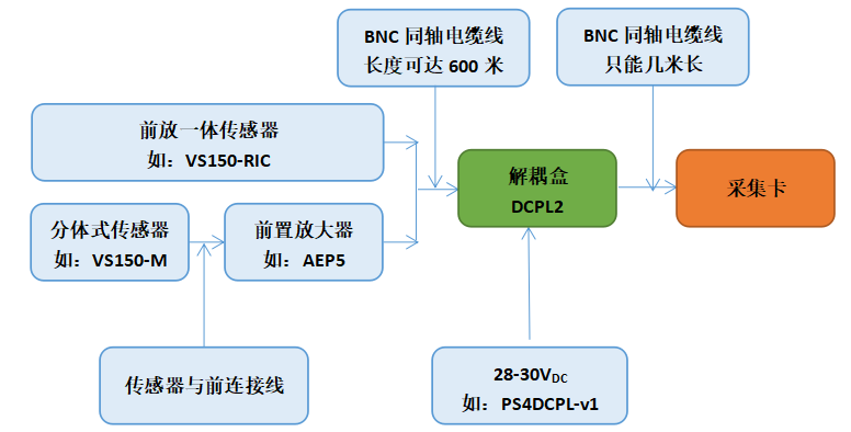 DCPL2解耦盒是專爲不能(néng)給前置放大器供電的采集卡而設計的,其作用就是給前置放大器提供電源的同時傳輸傳感器獲取的信号。由于前置放大器的正常工作都(dōu)需要提供額外的電源,Vallen公司的采集卡都(dōu)設計有專門對(duì)前置放大器供電的模塊,所以無需配置DCPL2解耦盒就能(néng)使用,而市面(miàn)上還(hái)有很多不是聲發(fā)射專用的采集卡,此類采集卡上沒(méi)有設計前置放大器的供電模塊,而又想使用Vallen公司的前放一體化傳感器或者分體式傳感器時就需要配置DCPL2解耦盒才能(néng)正常使用。