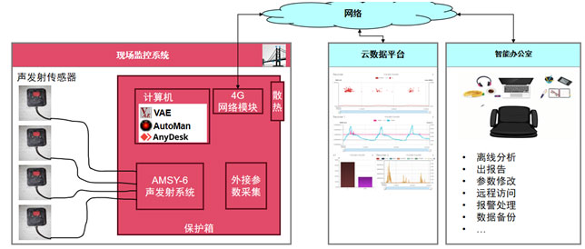德國(guó)Vallen公司聲發(fā)射監測系統主要由多通道(dào)AMSY-6聲發(fā)射采集系統、自動化管理軟件和雲數據平台組成(chéng)。多通道(dào)AMSY-6聲發(fā)射采集系統已在其他資料中有詳細介紹,這(zhè)裡(lǐ)主要介紹自動化管理軟件和雲數據平台。